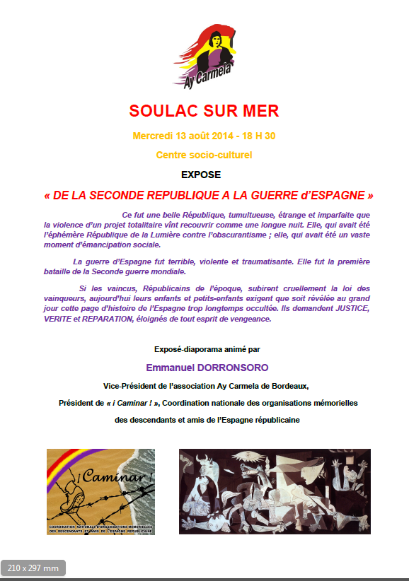 Ce fut une belle République, tumultueuse, étrange et imparfaite que la violence d’un projet totalitaire vînt recouvrir comme une longue nuit. Elle, qui avait été l’éphémère République de la Lumière contre l’obscurantisme ; elle, qui avait été un vaste moment d’émancipation sociale. La guerre d’Espagne fut terrible, violente et traumatisante. Elle fut la première bataille de la Seconde guerre mondiale. Si les vaincus, Républicains de l’époque, subirent cruellement la loi des vainqueurs, aujourd’hui leurs enfants et petits-enfants exigent que soit révélée au grand jour cette page d’histoire de l’Espagne trop longtemps occultée. Ils demandent JUSTICE, VERITE et REPARATION, éloignés de tout esprit de vengeance.